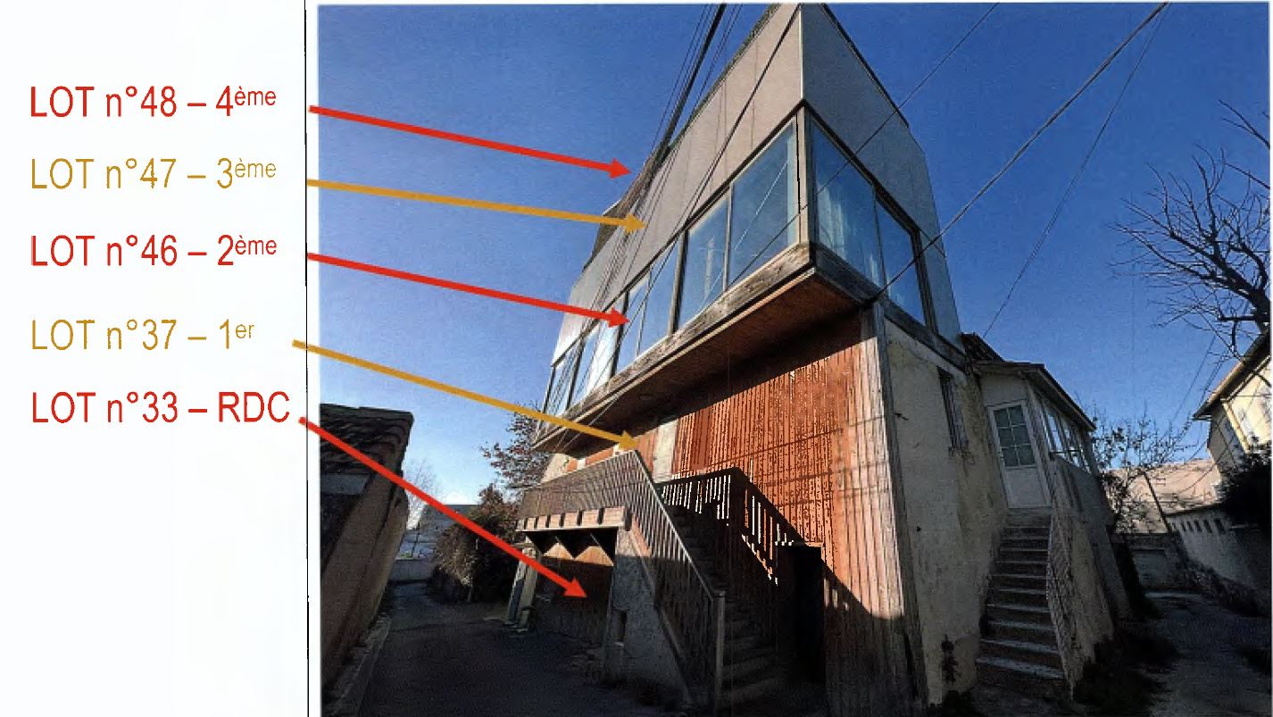 Il est composé d'un hall d'entrée avec escalier d'accès à l'étage supérieur (lot n°46) distribuant sur la gauche la 1ère pièce avec un WC indépendant et sur la droite la 2ème pièce avec un WC indépendant.