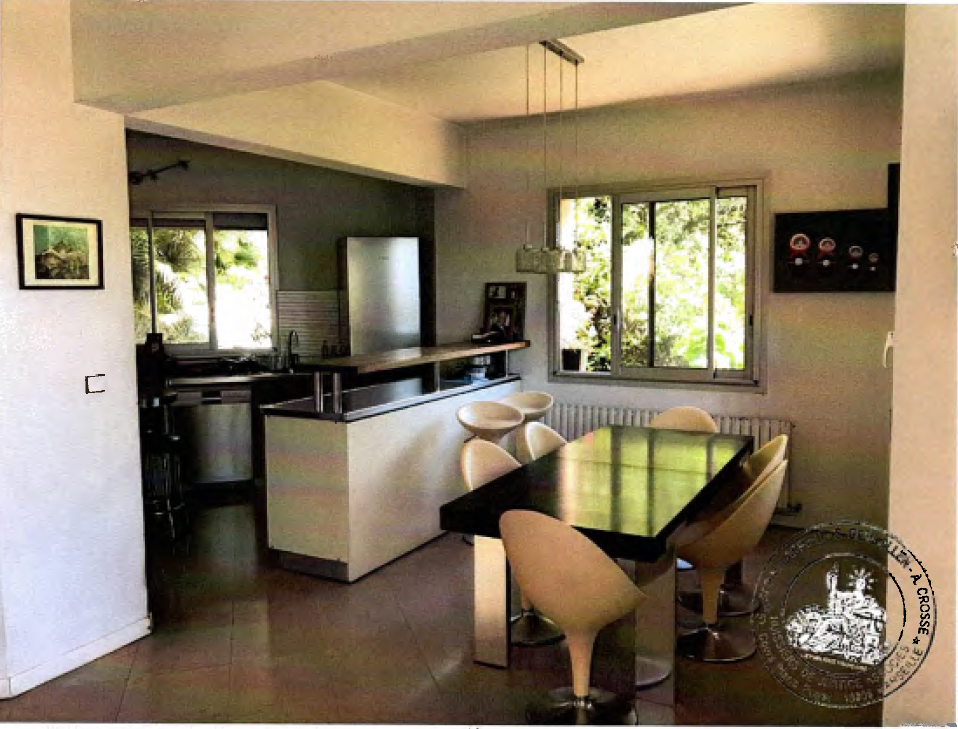 Le rez-de-jardin comprend une entrée, ue cuisine avec coin repas, un salon, un WC, une terrasse et deux escaliers.